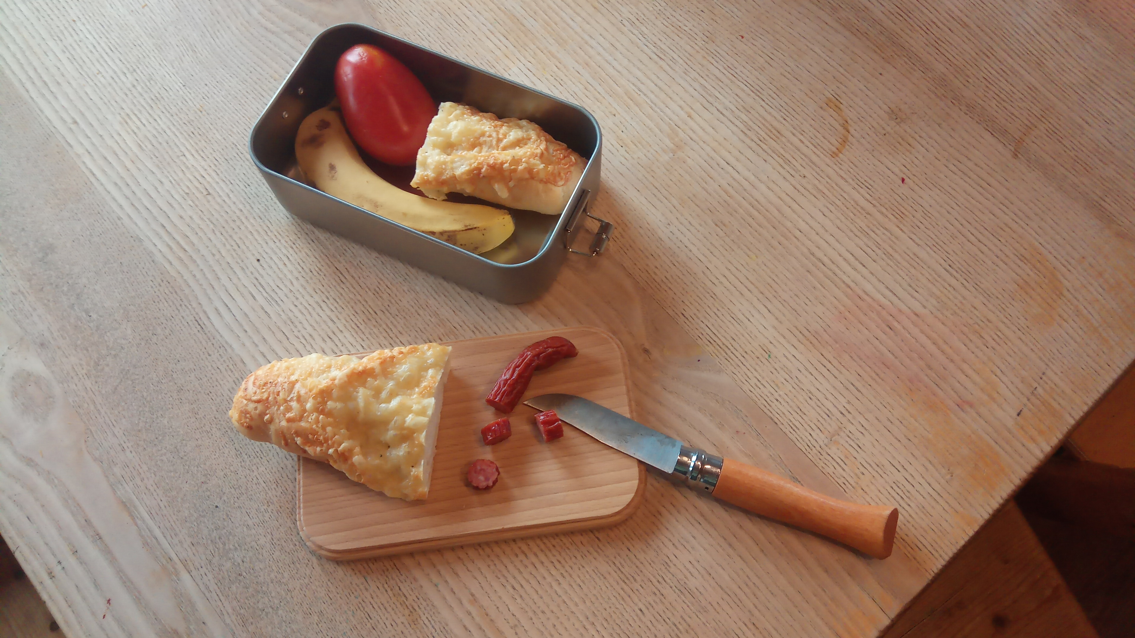 Diese nachhaltige Jausenbox aus Weißblech ist mit einem Eichenbrett bestückt.